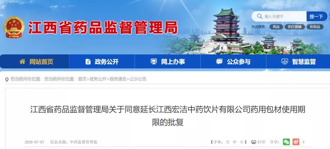7月7日,江西省藥品監督管理局,發布《關于同意延長江西宏潔中藥飲片有限公司藥用包材使用期限的批復》。